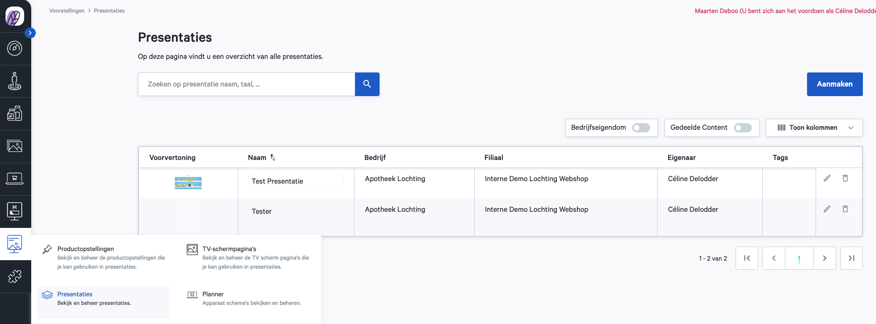 Een overzicht van alle presentaties binnen jouw bedrijf en filialen zie je via Voorstellingen > Presentaties. Hier zie je alle presentaties met voorvertoning, naam, bedrijf, filiaal, eigenaar en tags.